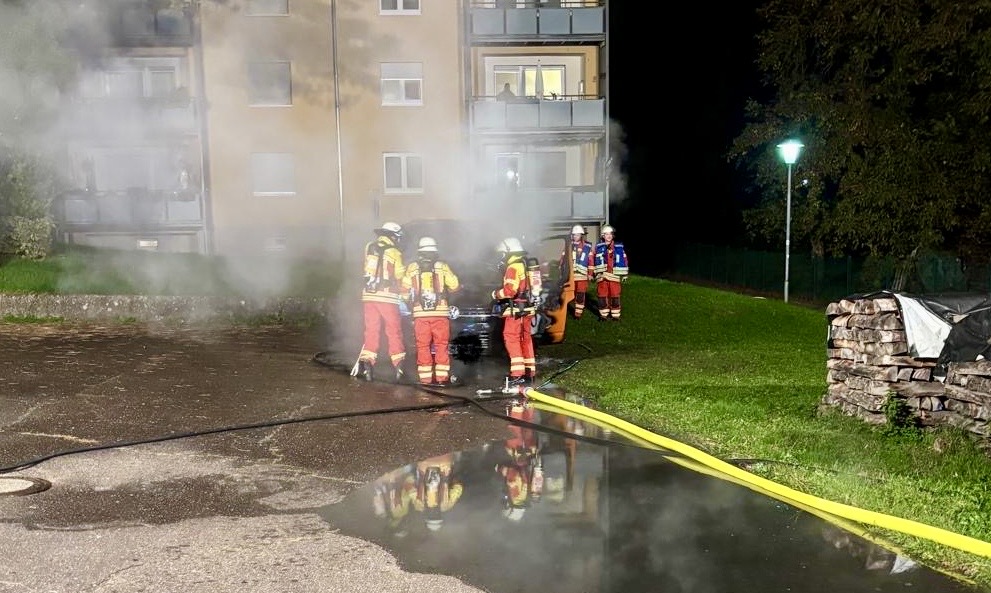 Am Samstagabend wurde die Feuerwehr Obrigheim zu einem Fahrzeugbrand B1 innerorts alarmiert. Das brennende Fahrzeug befand sich hinter einer Garage direkt neben einem Mehrfamilienhaus. Beim Eintreffen der Einsatzkräfte stand das Fahrzeug bereits in Vollbrand.