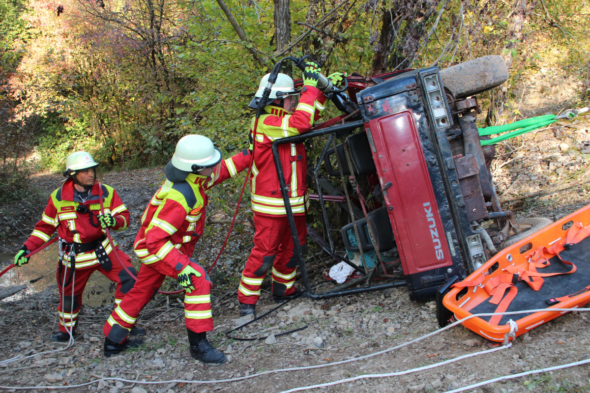 Asbach. (hag) „Schwerer Verkehrsunfall auf der Gemeindeverbindungsstraße zwischen Obrigheim und Mörtelstein, zwei Fahrzeuge Frontalzusammenstoß, ein Fahrzeug wurde den Abhang hinunter geschleudert, drei Schwerverletzte“, das war das angenommene Unfallszenario zu der über 30 Feuerwehrangehörige der Abteilungen Obrigheim, Asbach und Mörtelstein in den ehemaligen Asbacher Steinbruch gerufen wurden.