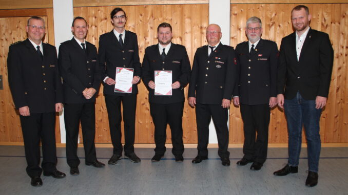Bei der Freiwilligen Feuerwehr Abteilung Mörtelstein wurden Pascal Streib (4. von links) zum Löschmeister und Benno Huber (3. von links) zum Feuerwehrmann befördert; gratuliert wurde Michael Kindermann (3. von rechts) zur Auszeichnung für 40-jährigen Feuerwehrdienst.